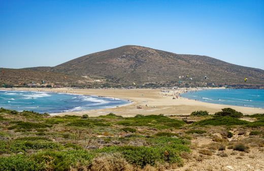 A golden-sand paradise beneath the famous Tsambika Monastery, ideal for swimming and sunbathing.